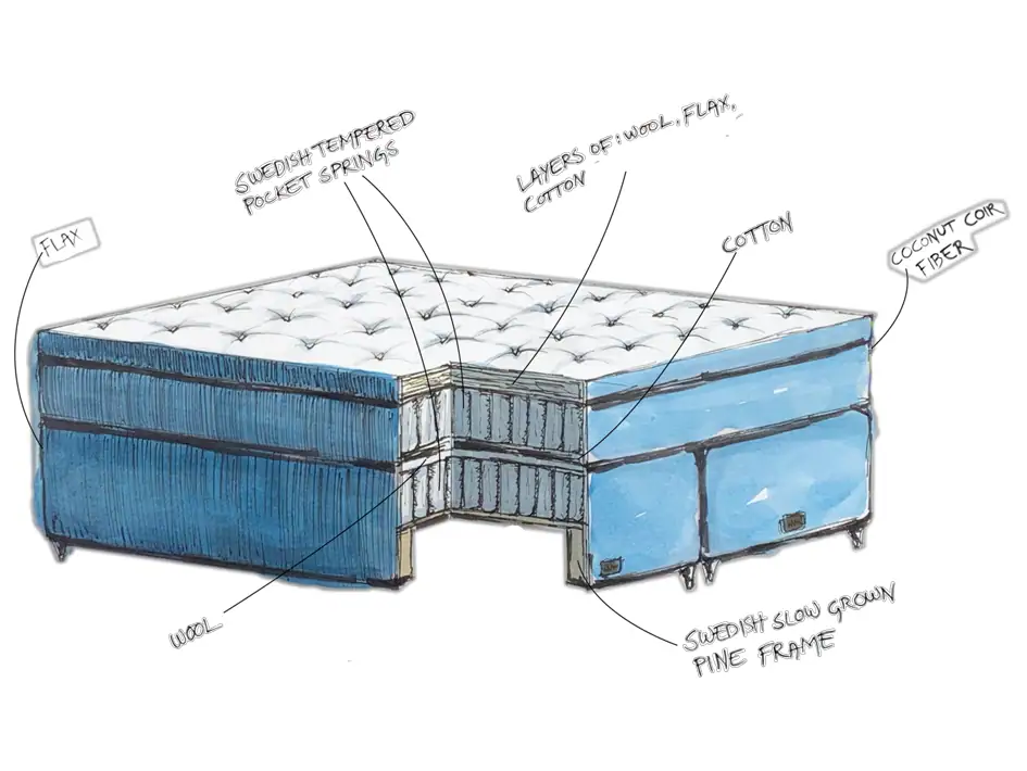 Mattsons use different materials including Global Organic Textile Standard (GOTS) Organic Cotton, Tokowool, fine spun horse hair, coconut coir fibre and slow grown pine wood to ensure the best possible sleep experience. Natural materials stand out as the best choice for those seeking a healthy, comfortable, and sustainable sleeping environment.