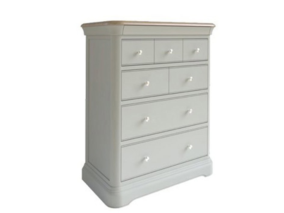 Abigail chests in subtle pastel paint finishes and oak, complemented by soft curves. The frame evokes a traditional French style. Bright chrome plated hardware gives it a fresh look that suits both modern and country living.