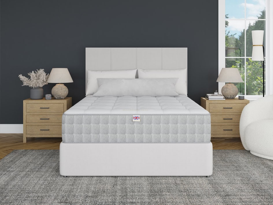 Layers include a chemical free Smooth-Flex tuft free cover, Hampshire wool and silk, fine English spun cotton, 1000 Comfonomic springs, 1000 ErgoZone7 Pocket Springs, GRS re-cycled soft white fibres and a non slip cover on the bottom of the mattress.