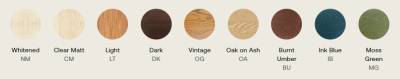 Finishes available: Whitened (NM), Clear Matt (CM), Light (LT), Dark (DK), Vintage (OG), Oak on Ash (OA), Burnt Umber (BU), Ink Blue (IB), Moss Green (MG).