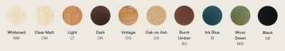 Wood finishes available: (NM) Whitened, (CM) Clear Matt, (LT) Light, (DK) Dark, (OG) Vintage, (OA) Oak on Ash, (BU) Burnt Umber, (IB) Ink Blue, (MG) Moss Green or (SB) Black.