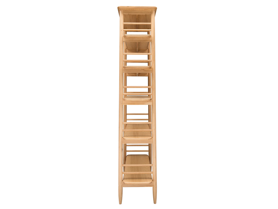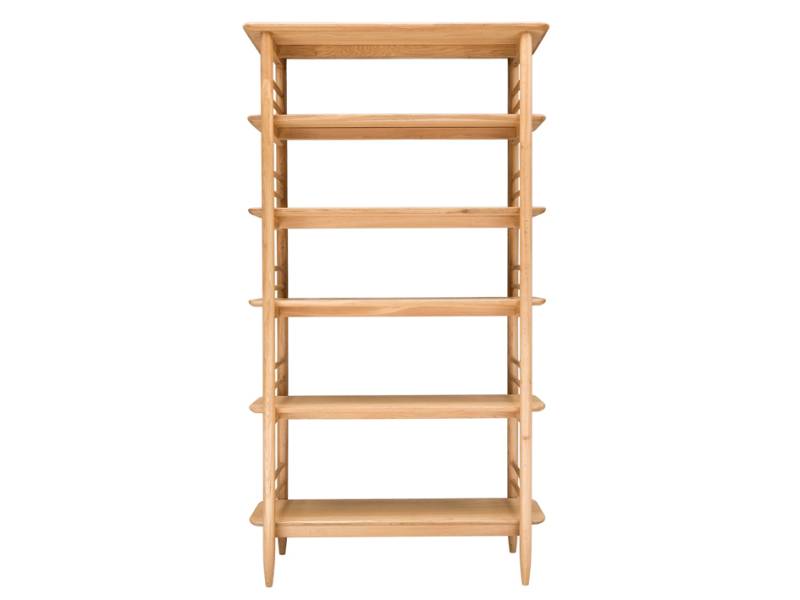 Made of pale oak, the contemporary ercol Teramo shelving unit is ideal for displaying books and treasured possessions. The ercol design style shows in the considered detail, from the overhanging top and elegant turned legs to the distinctive, spindled sides.