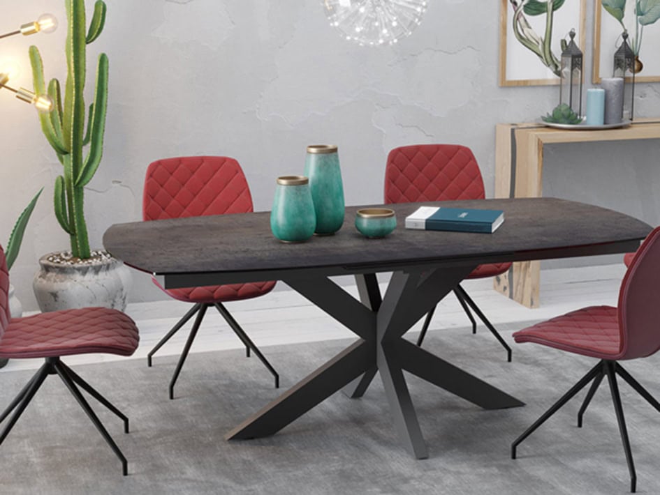 Dine with ease with the Palmer dining table. The Palmer table feature legs in matt black lacquer steel, providing a sleek look. The table top extends out in length, creating more space for more guests. The tabletop is a 3mm thick ceramic plate glued upon an 8mm glass pane.