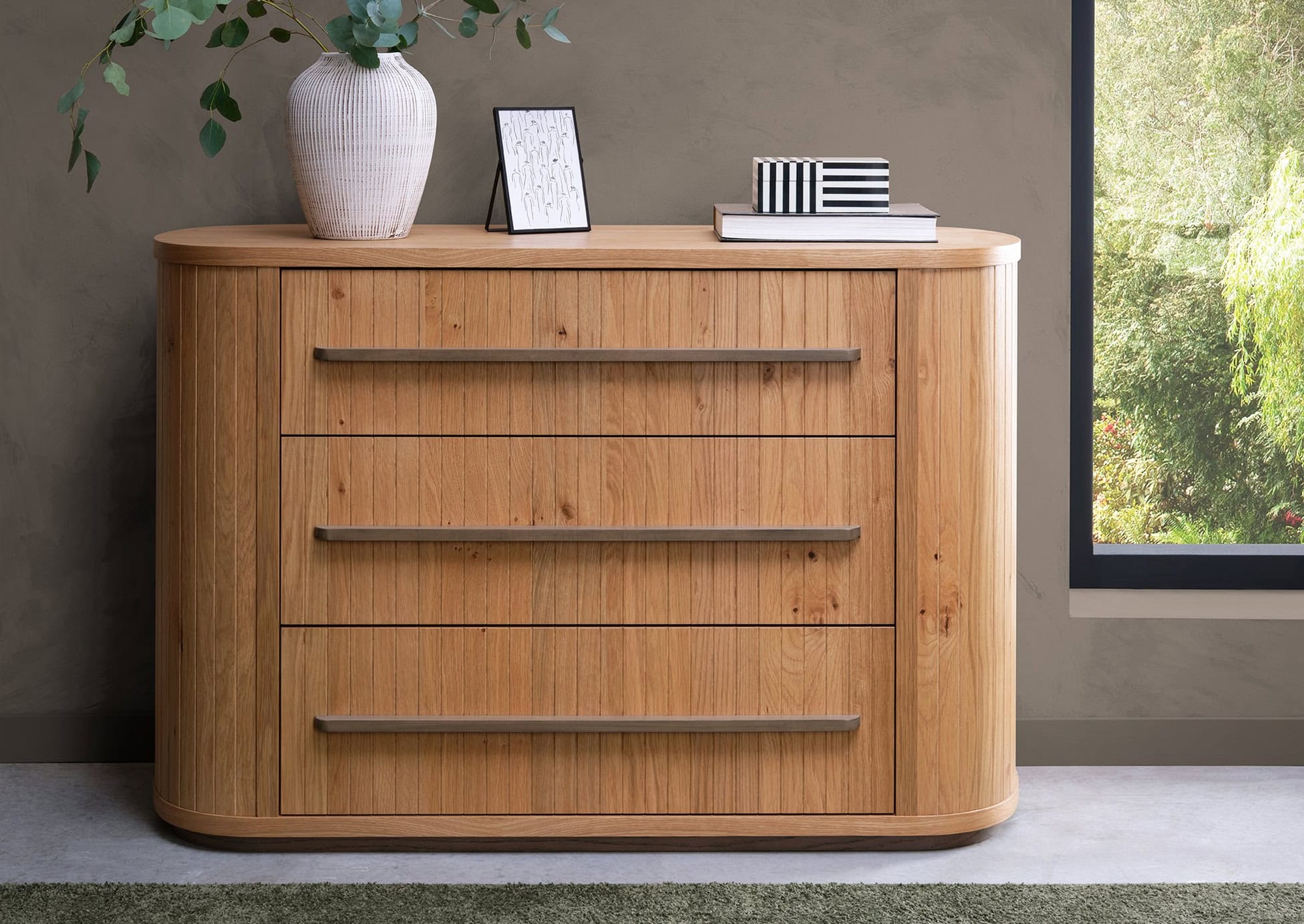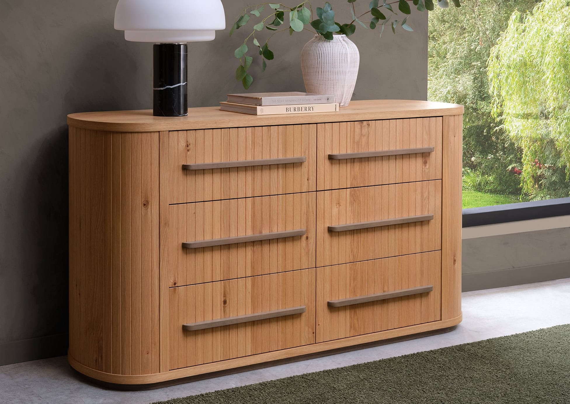 The Viola Bedroom Range brings a sense of crafted character to contemporary spaces, combining knotty oak veneers with a soft weathered finish and expressive grain. Curved profiles and subtle groove detailing run throughout the range, lending cohesion and balance to each piece. Generous drawer storage is provided through softly contoured chests and elliptical nightstands, available in both three-drawer and open-shelf variations to suit a variety of room layouts and lifestyles.